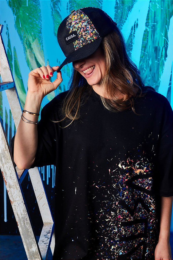 Este boné preto é mais do que um acessório; é uma peça de arte vestível, nascida da colaboração entre o CAUSA e o artista Hugor.