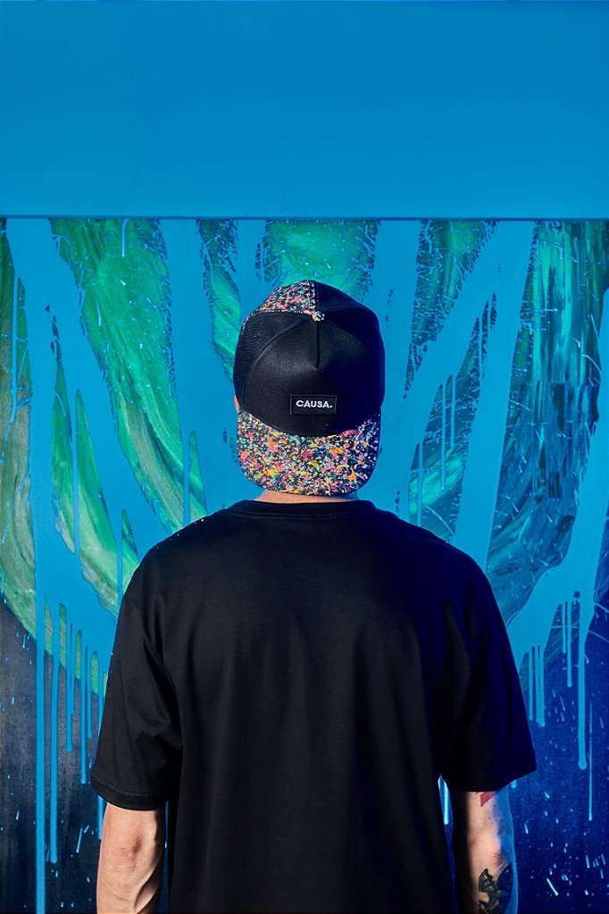 Este boné preto é mais do que um acessório; é uma peça de arte vestível, nascida da colaboração entre o CAUSA e o artista Hugor.